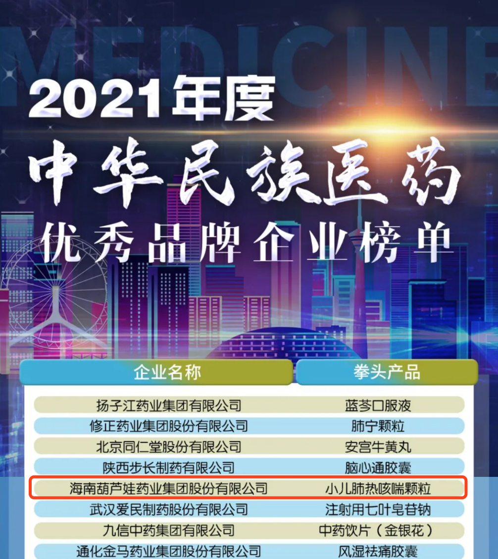12月29日,全国工商联医药业商会发布了“2021年度中华民族医药优秀品牌企业榜单”,DB视讯药业集团凭借黄金单品小儿肺热咳喘颗粒(4克)实力登榜。